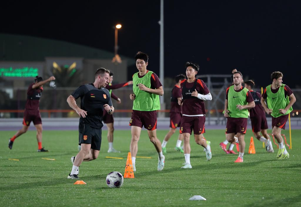 3月18日,中國(guó)國(guó)家男子足球隊(duì)在沙特阿拉伯首都利雅得進(jìn)行賽前訓(xùn)練。新華社記者 王東震 攝