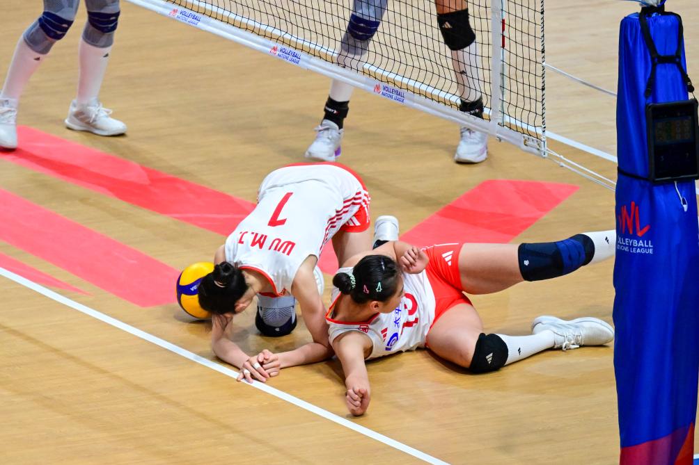 中國(guó)隊(duì)球員吳夢(mèng)潔(下左)和王奧芊(下右)在比賽中救球。 新華社記者 朱煒 攝