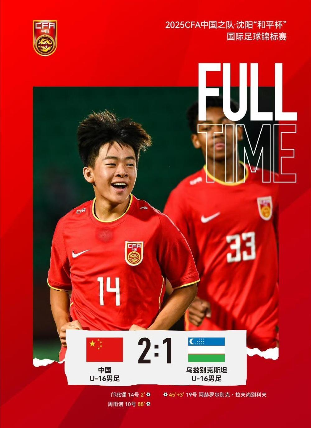 新華社沈陽7月6日電(記者 劉藝淳)6日,2025CFA中國之隊·沈陽“和平杯”國際足球錦標(biāo)賽次輪在沈陽城市體育場舉行,憑借周雨諾最后時刻的遠(yuǎn)射破門,中國U16男足完成“準(zhǔn)絕殺”,以2:1力克烏茲別克斯坦隊,保留爭冠希望。