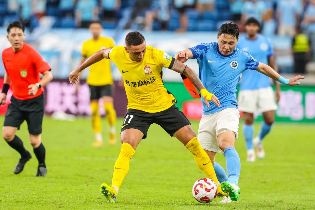 9月28日,青島西海岸隊(duì)球員戴維森(前左)在比賽中拼搶。新華社發(fā)(彭志剛攝)