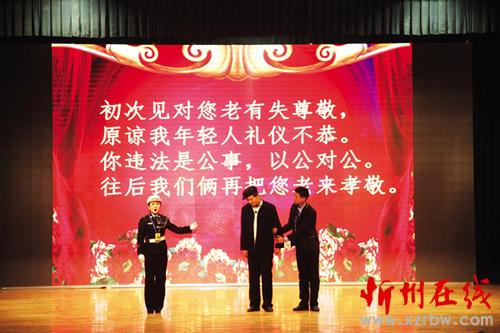 1月27日至29日,偏關(guān)縣公安局交警大隊交通安全文藝宣傳隊在隊長們的帶領(lǐng)下,先后走進市實驗中學(xué)、市客運中心、國家電網(wǎng)忻州供電分公司進行了三場演出,用自編自導(dǎo)自演、群眾喜聞樂見的“漫翰調(diào)”、“二人臺”、北路梆子、民歌等一系列極具地域文化特色的地方小戲、說唱歌舞等曲藝形式進行宣傳演出,贏得滿堂喝彩,場場掌聲雷動。作為春節(jié)回家路上的一道文化盛宴,這次春節(jié)前的平安出行警示教育“送安全下鄉(xiāng)”巡演是我市公安交警精心策劃、編排的春運交通安全宣傳行動之一。28日,市客運中心人頭攢動,熙熙攘攘,大廳外懸掛的橫幅標語“守護您的平安出行,保障道路安全暢通是每一位交警的神圣職責(zé)!”格外醒目。候車大廳里,暖意融融,市公安局交警支隊組織的春運交通安全文藝演出正在進行,交警版的民間小調(diào)《拜大年》、小品《警鐘聲聲》、雙簧《二愣子》等節(jié)目令人賞心悅目、捧腹不止。在歡笑之余,提醒和教育廣大群眾自覺抵制不文明、不安全交通行為,觀看演出的旅客和客車司機紛紛感慨,這樣的宣傳教育生動形象,人人愛看且耐人尋味,警示作用很大。