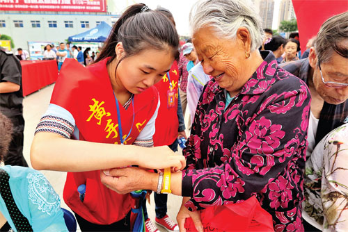 參與活動的愛心志愿者通過豐富多彩的文藝節(jié)目,宣傳黃手環(huán)的正確使用方法,還向廣大市民講解有關(guān)老年人的護(hù)理知識和一些急救常識,相關(guān)醫(yī)療機(jī)構(gòu)派出專業(yè)人員在現(xiàn)場開展了義診活動,市老齡辦對本次慈善公益活動給予了大力支持。圖為志愿者在為一位老人戴上黃手環(huán)。(魯明強(qiáng) 攝影報(bào)道)