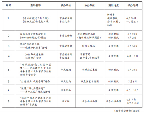 具體活動(dòng)主要包括八項(xiàng)內(nèi)容:1、在忻州橫店影城,全市農(nóng)村、社區(qū)公映紅色愛(ài)國(guó)主義教育影片。2、我省優(yōu)秀晉京展演劇目《云水松柏續(xù)范亭》展演。3、舉辦“永遠(yuǎn)的長(zhǎng)征——黨建知識(shí)競(jìng)賽”活動(dòng)。4、舉行2016 年優(yōu)秀童謠征集推廣活動(dòng)。5、舉辦“頌歌獻(xiàn)給黨、共筑中國(guó)夢(mèng)”——紀(jì)念建黨95 周年暨紅軍長(zhǎng)征勝利80 周年音樂(lè)會(huì)。6、舉辦“紅色經(jīng)典、戲劇專(zhuān)場(chǎng)”晚會(huì)。7、開(kāi)展“激情廣場(chǎng)、共圓夢(mèng)想”——第十三屆廣場(chǎng)文化活動(dòng)。8、舉辦“紀(jì)念建黨95 周年暨紅軍長(zhǎng)征勝利80 周年”書(shū)畫(huà)展。
