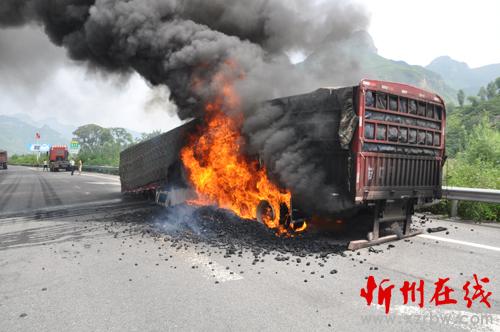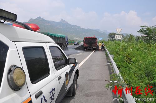2016年8月6日上午11時20分,高速交警二支隊九大隊值班室接警陳:在五保高速(保五方向)32公里處有半掛車起火,請求出警。接到報警后,值班人員立即上報隊領(lǐng)導,值班教導員牛治國立即安排部署,派出事故中隊立即趕赴現(xiàn)場,秩序中隊在耿鎮(zhèn)收費站進行分流。