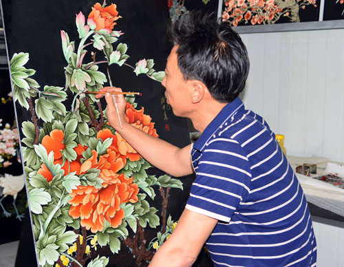 畫工在推光漆畫上描繪精美圖案