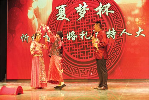 李忠憲參加忻州首屆婚禮主持人大賽的作品是《地域風情(民俗·佛樂)》。他介紹作品時說:“當我得知自己進入決賽時,我突然想起今年《人說山西好風光》山西旅游發(fā)展大會上我市領(lǐng)導的講話,講話樸實誠懇,讓我印象深刻。決定了這個方案后,我找到當時的視頻,一字一句把領(lǐng)導的講話寫了下來。按照這個思路我展開了想象(五臺圣境·雁門雄風·蘆芽美景·黃河風情),想到山西的母親河,汾河源頭寧武與八音之鄉(xiāng)定襄,當住在汾河源頭的小伙遇到聽著民樂長大的姑娘時,小伙的心融化了,為了得到定襄姑娘的芳心,小伙下決心學會了吹嗩吶,就這樣你來我往,情定今生。因為在傳統(tǒng)婚禮中有交杯酒之類的儀式,所以在這個環(huán)節(jié)我選擇了將汾河源頭的福水,與充盈著定襄鍛造神韻并感染了佛國靈性的貫流之水合二為一,最后我想到了五臺山,有了佛光普照,為新人祈福,為蒼生庇佑的想法,于是出現(xiàn)了新人手持蓮花寶燈,全場嘉賓雙手合十,祈福庇佑的場景?!?/p>