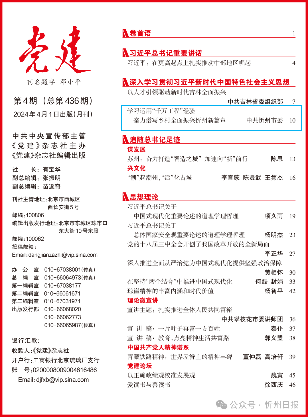 【導讀】2024年第4期《黨建》雜志“深入學習貫徹習近平新時代中國特色社會主義思想”欄目,刊發(fā)了中共忻州市委署名文章《學習運用“千萬工程”經(jīng)驗 奮力譜寫鄉(xiāng)村全面振興忻州新篇章》。以下是全文。