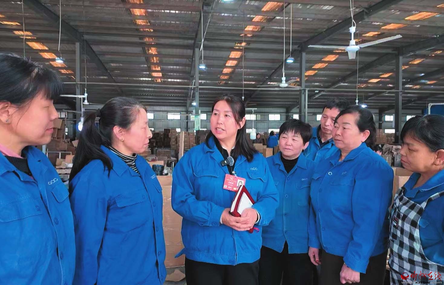 范銀蓮在車間宣講全國兩會精神。