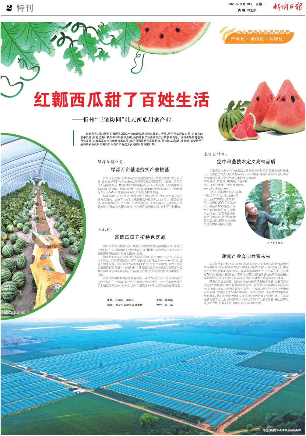 秋高氣爽,晉北忻州的田野間,西瓜產(chǎn)業(yè)的蓬勃脈動仍在回響。今夏,忻府區(qū)的萬畝大棚、定襄縣的空中瓜林、忻府區(qū)奇村鎮(zhèn)加禾村的富硒瓜田,共同繪就了忻州西瓜產(chǎn)業(yè)的多彩畫卷。以綠淼果蔬引領(lǐng)規(guī)模化發(fā)展、定襄農(nóng)富合作社創(chuàng)新技術(shù)品質(zhì)、加禾村探索特色富硒種植,科技鏈、品牌鏈、共富鏈“三鏈協(xié)同”的特優(yōu)農(nóng)業(yè)機(jī)制正驅(qū)動忻州西瓜產(chǎn)業(yè)成為鄉(xiāng)村振興的甜蜜引擎。