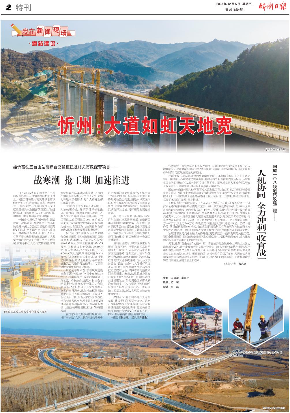 夕陽西下,施工現(xiàn)場的燈光逐漸亮起,建設(shè)者們依然堅守崗位。這座正在崛起的綜合交通樞紐,不僅承載著便捷出行的民生期待,更肩負著區(qū)域發(fā)展的時代使命,在冬日的五臺山腳下,書寫著高質(zhì)量建設(shè)的新篇章。(本報記者張志遠 通訊員肖世勛)