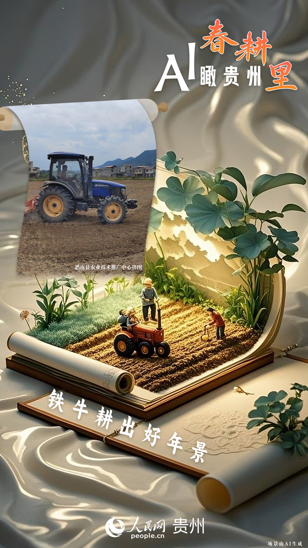 春回大地,萬物復(fù)蘇,黔地山川間正上演著一場生機(jī)勃勃的春耕盛景。傳統(tǒng)農(nóng)耕與現(xiàn)代科技在這里交織,描繪出一幅幅充滿希望的畫卷。 春耕不僅是農(nóng)時的序曲,更是科技與土地對話的現(xiàn)場。在貴州這片喀斯特地貌與民族文化交織的土地上,春耕正經(jīng)歷一場靜默的變革:無人機(jī)掠過千年梯田,算法解析紅壤墑情,覆膜機(jī)織就“智能外衣”,而彎腰勞作的農(nóng)人,依然用繭手傳遞著古老農(nóng)耕文明的溫度。 本期跟隨AI一起描繪貴州春耕里的故事。