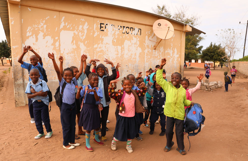 2023年7月25日,莫桑比克馬普托省皮科科村學(xué)校的孩子們站在裝有中國(guó)援助的衛(wèi)星電視接收天線的房屋前。“萬(wàn)村通”項(xiàng)目旨在為非洲國(guó)家的1萬(wàn)個(gè)村莊接入衛(wèi)星數(shù)字電視信號(hào),項(xiàng)目2018年在莫桑比克啟動(dòng),為該國(guó)1000個(gè)村落、2萬(wàn)戶家庭和3000個(gè)公共場(chǎng)所安裝衛(wèi)星電視設(shè)備,提供電視信號(hào)和節(jié)目,覆蓋農(nóng)村人口達(dá)250萬(wàn)。新華社記者 董江輝 攝