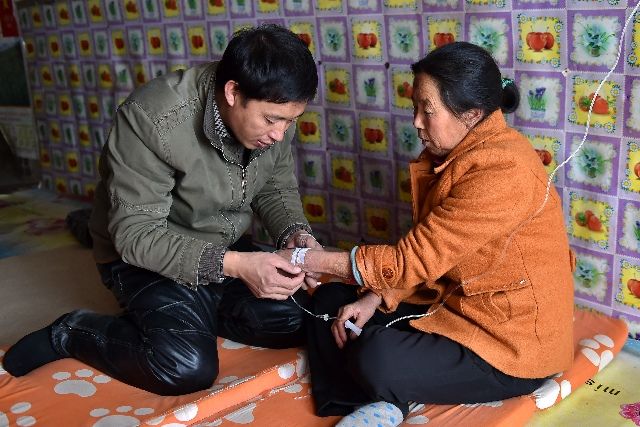 賀星龍(左)在為山西省臨汾市大寧縣徐家垛鄉(xiāng)曹家坡村的一位村民看病。新華社記者曹陽(yáng)攝