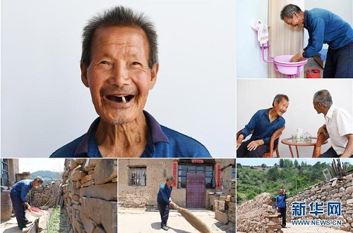 魏連保,男,1949年出生,山西省長治市沁源縣支角村人。獨(dú)居的他生活不便,2017年年底,村委會(huì)為魏連保在內(nèi)的8位老人修建了一排整齊的新居,并統(tǒng)一安排就餐。 左上:魏連保肖像;右上:魏連保在新居洗臉;右中:魏連保(左)在新居和鄰居李秀成聊天;下右:魏連保在舊居前留影;下中:魏連保在舊居打掃院子;下左:魏連保在舊居為蔬菜澆水(拼版照片,6月18日攝)。 地處晉東南的山西省長治市,位于由太行山、太岳山環(huán)繞而成的上黨盆地中。在群山中、崖壁上,許多村莊自然條件惡劣,基礎(chǔ)設(shè)施落后,脫貧致富是大山深處人們的迫切心愿。 近年來,一場(chǎng)場(chǎng)脫貧攻堅(jiān)戰(zhàn),在一個(gè)個(gè)深山村打響。政府全力探索脫貧路徑的同時(shí),山區(qū)百姓因地制宜,靠自己的雙手和智慧走上致富路,交出了一份扎實(shí)的脫貧答卷。 記者在太行山、太岳山一路尋訪,記錄下多位70歲老人的生活。這些共和國的同齡人,親歷了山鄉(xiāng)的巨變,見證著長治山區(qū)脫貧攻堅(jiān)偉大工程的一步步推進(jìn)。 新華社記者 楊晨光 攝