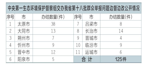中央第一生態(tài)環(huán)境保護(hù)督察組交辦我省第十八批群眾舉報(bào)問(wèn)題125件,辦結(jié)125件。公示125件,其中太原市38件、大同市13件、朔州市7件、忻州市9件、晉中市12件、陽(yáng)泉市5件、呂梁市8件、長(zhǎng)治市14件、晉城市4件、臨汾市9件、運(yùn)城市6件??傻卿浬轿魇∪嗣裾W(wǎng)站或掃描二維碼查閱群眾信訪舉報(bào)轉(zhuǎn)辦和邊督邊改公開(kāi)情況一覽表。
