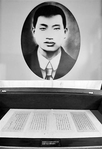 圖為拼版照片。上圖為陳覺像;下圖為湖南省長(zhǎng)沙市烈士公園展出的陳覺烈士寫給妻子趙云霄的遺書(5月7日攝)。新華社發(fā)