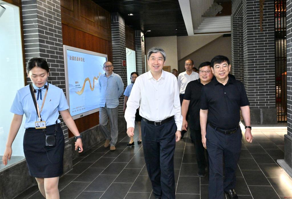 在中國汾酒城,朱曉東一行登上西城樓,俯瞰酒城全貌,聽取汾酒城的建設(shè)規(guī)模、生產(chǎn)經(jīng)營、產(chǎn)品銷售等情況介紹。隨后,朱曉東一行走進(jìn)汾酒博物館,通過館陳文物、文獻(xiàn)史料、文人墨寶等,切身感受汾酒集團的企業(yè)文化,了解企業(yè)歷史沿革、技術(shù)創(chuàng)新及汾酒的釀造技藝等情況。