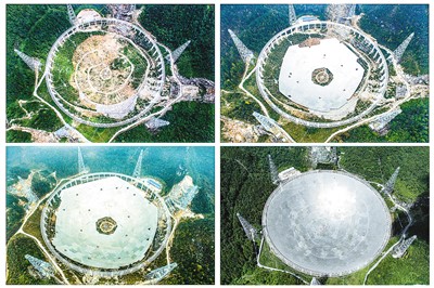 這是一張拼版照片:依次為“中國天眼”拼裝第一塊反射面板(左上,2015年8月2日攝)、“中國天眼”反射面板安裝近半(右上,2015年12月16日攝)、“中國天眼”反射面板安裝近八成(左下,2016年3月9日攝)、維護(hù)保養(yǎng)期間的“中國天眼”(右下,2022年7月21日攝)。新華社記者 歐東衢攝