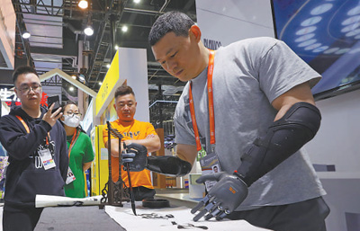 中國(guó)品牌博覽會(huì)上,工作人員用腦機(jī)科技操控的假肢寫毛筆字。新華社記者 方 喆攝