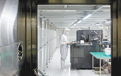 穿上防塵服,再經過兩次噴淋除塵,記者才能進入創(chuàng)新中心的芯片封裝測試驗證平臺。