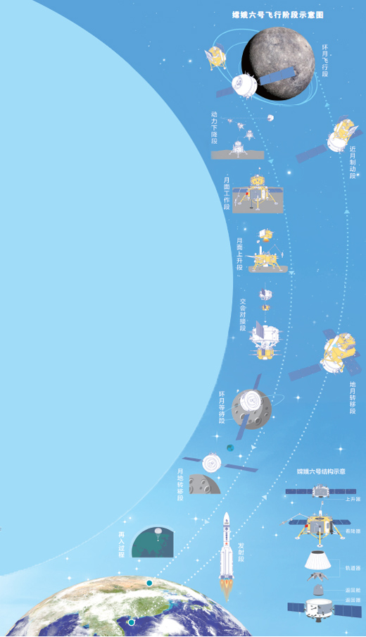 嫦娥五號(hào)探測(cè)器擁有“往返票”:在完成樣品采集后,還需將月球樣品帶回地球。23天時(shí)間、11個(gè)重大階段和重要步驟,科研人員迎難而上,創(chuàng)造了在地外天體的采樣與封裝等5項(xiàng)“中國(guó)首次”。