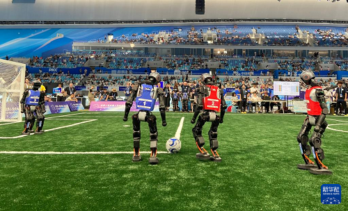 圖為2025世界人形機(jī)器人運(yùn)動會上機(jī)器人在踢足球。新華社記者 魏夢佳 攝