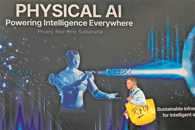 從制造業(yè)到醫(yī)療,從交通到家庭服務(wù),物理AI正以前所未有的深度融入并賦能各行各業(yè)。圖為一名男子在2026年美國(guó)拉斯維加斯消費(fèi)電子展上走過印有物理AI字樣的展臺(tái)。新華社發(fā)(曾慧攝)