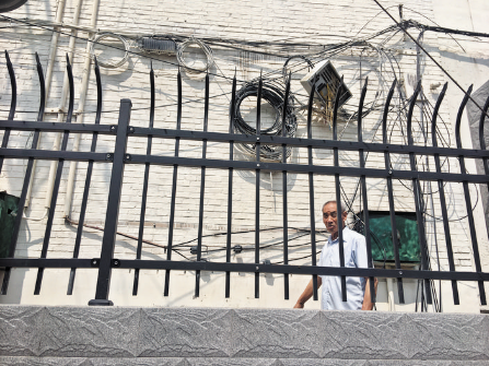 記者在位于該路口的市化工局宿舍樓側面墻上看到布滿“蛛網”般的電線,藕斷絲連,錯綜復雜。小區(qū)住戶劉大爺告訴記者,這堵墻上的電線種類繁多復雜,最要緊的是其中的高壓電線固定在距離地面只有1米至1.5米左右的墻上,電線外面的PVC保護管已經因年久失修嚴重老化,電線直接裸露在外,遇上下雨打雷天氣非常危險,平時小孩玩耍路過也不安全。據記者觀察,在距離這堵墻約兩米的地方有1根電線桿,宿舍樓墻上離地面最近的4根黑色電線就是從這根電桿上接進來的,電線橫搭部分基本暴露在外,特別不安全。小區(qū)居民希望相關部門能夠盡快消除隱患,給居民們一個安全放心的居住環(huán)境。
