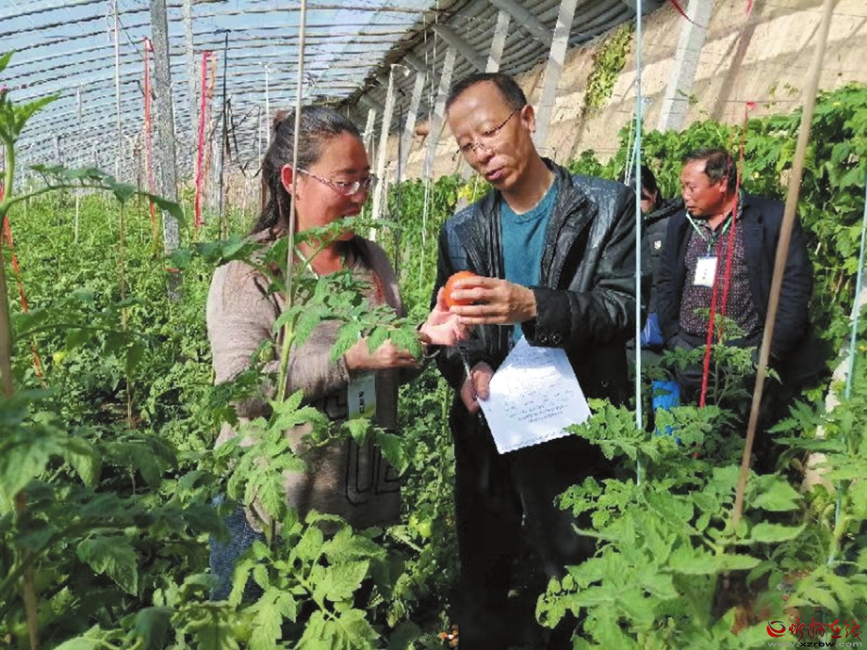 趙建華(右前)在大棚仔細(xì)檢查番茄長勢