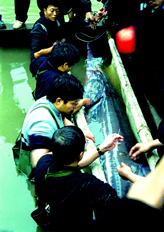 ▲2003年1月27日,在四川宜賓主城區(qū)附近的長(zhǎng)江岸邊,專家正在對(duì)一只白鱘進(jìn)行救治,這只白鱘是一位漁民在涪溪口發(fā)現(xiàn)的。