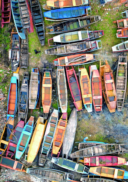 ▲湖北省宜都市枝城鎮(zhèn)白水港村一處“上岸”的漁船堆放點(diǎn)(無人機(jī)照片),這些收回的漁船將被集中拆解(2020年1月2日攝)。