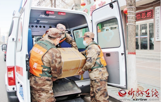 圖為民兵在搬運防疫物資。