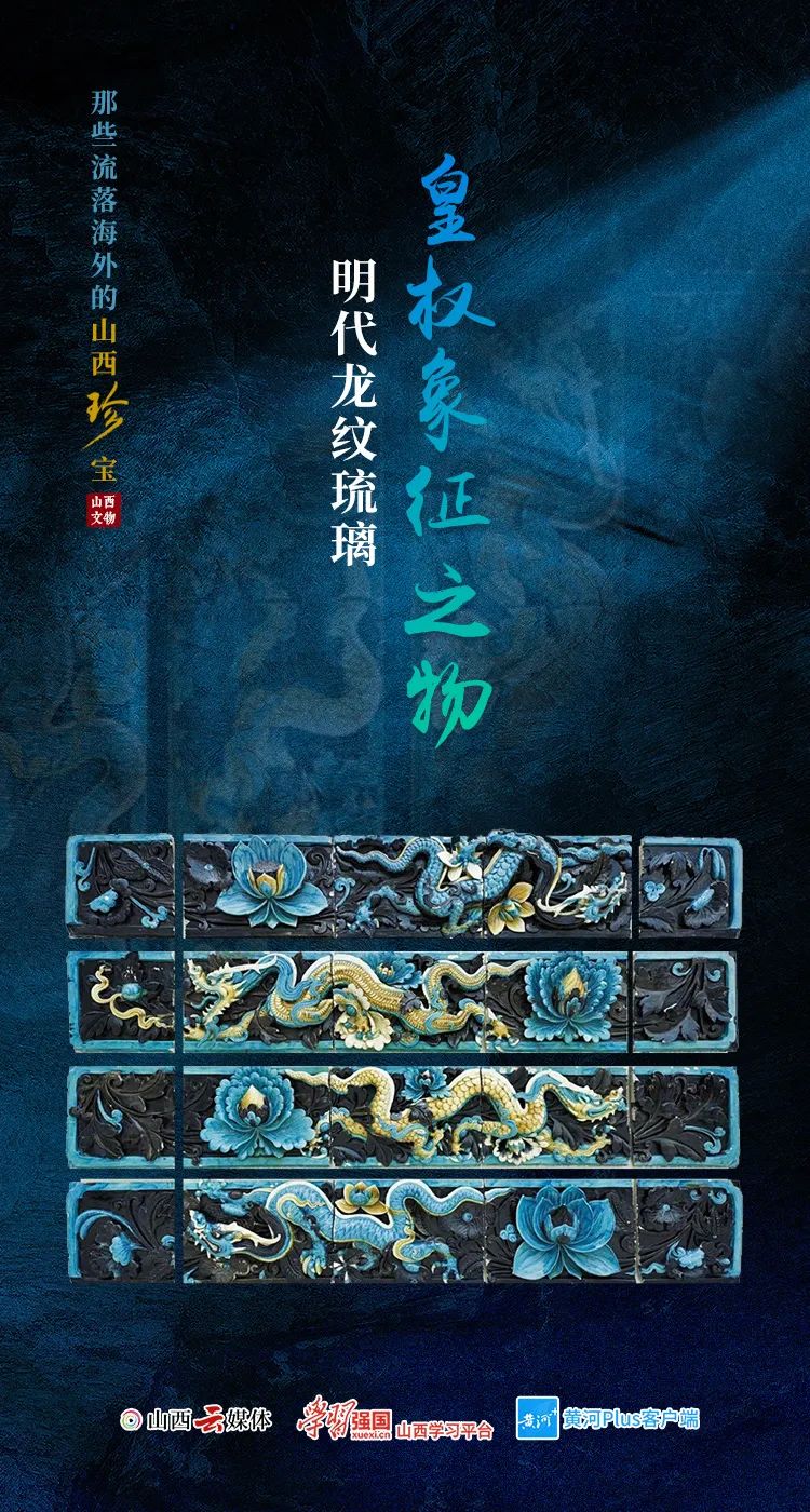 這套龍紋琉璃磚寬2.44米,每排高39厘米,厚12.7厘米,四條裝飾帶上四條充滿活力的藍黃釉山爪龍在蓮花與牡丹之間穿行嬉戲,第二條還歡快地追逐著一顆燃燒著的珍珠,可謂精致細膩,栩栩如生。 龍是中國古代吉祥如意和皇權的象征。山西在明代時期對琉璃技術的制作非常成熟,各種圖案的裝飾琉璃部件十分普遍。這一組二十塊的釉面瓷磚,打造于15至16世紀的山西,最初應該來自兩個不同的寺廟建筑。 上世紀清末民初的混亂期間,這組釉面瓷磚被人盜取,并被排列成壁板而收藏。這組文物是香港收藏家何鴻卿爵士在2006年拍賣所得,并捐贈給大英博物館。