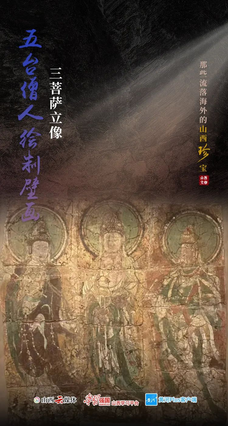 此壁畫描繪了帶有顯著頭光的三個菩薩立像。中間的菩薩為觀世音,他頭戴寶冠,冠上有阿彌陀佛像。左邊是普賢菩薩,他手持拂子,頭冠有三寶。右邊是文殊菩薩,他的頭冠亦有一佛像,并手持如意。 河北省清涼寺,建立于1183年。寺中一段1485年的題字記錄了寺院壁畫是山西省五臺山寺院于1424年委派僧人到清涼寺繪制的。 據考證,該壁畫就是從河北清涼寺第二殿內的木架上被移除,分成12塊運回倫敦的。收藏家喬治?尤摩弗帕勒斯購入此壁畫,并于1927年把它捐贈給大英博物館。