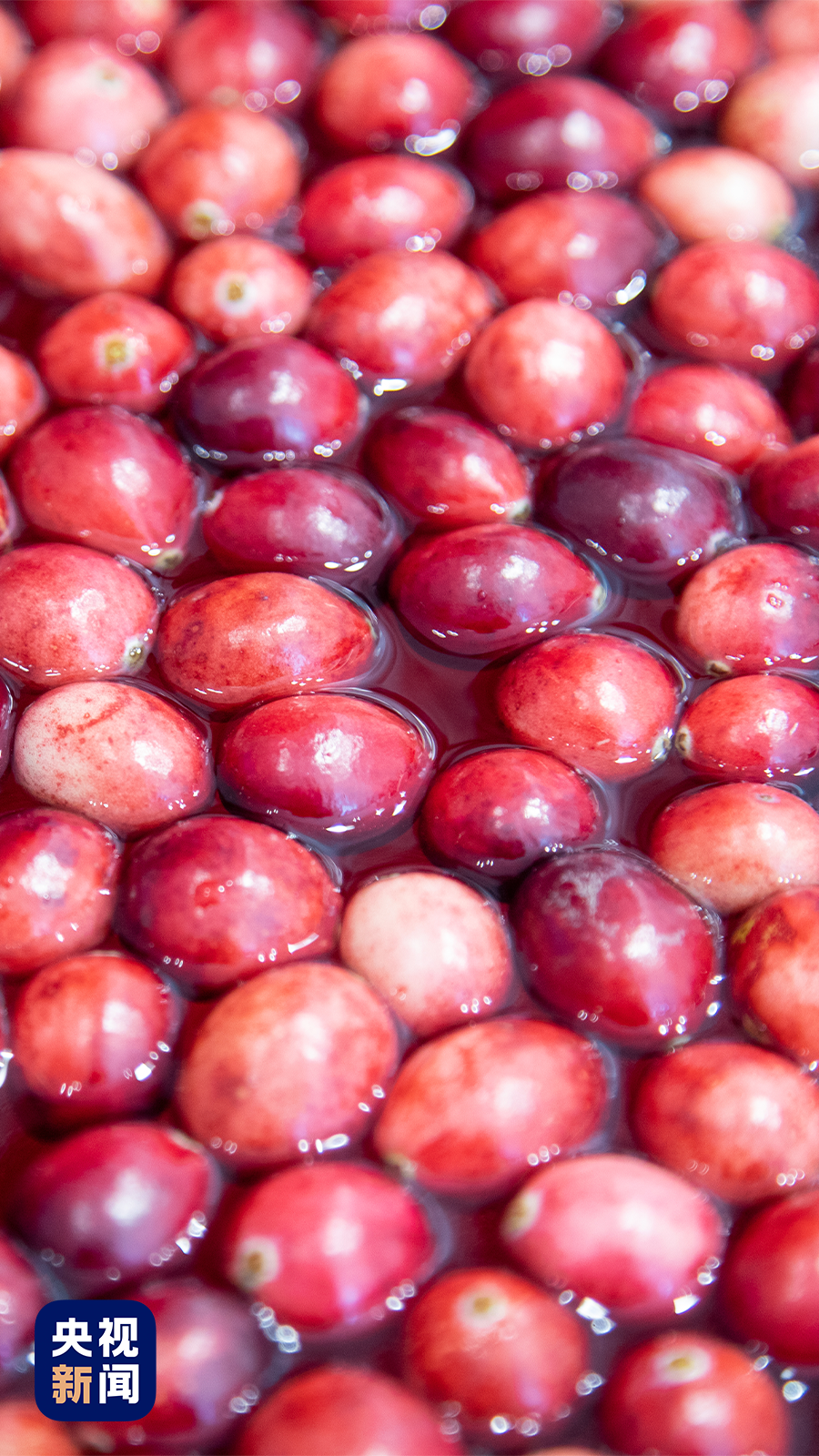 △蔓越莓采用水收的方式,即向蔓越莓田內注水淹沒植株,然后用機械水車在田間行走使果子脫落,再將其攏在一起裝車。