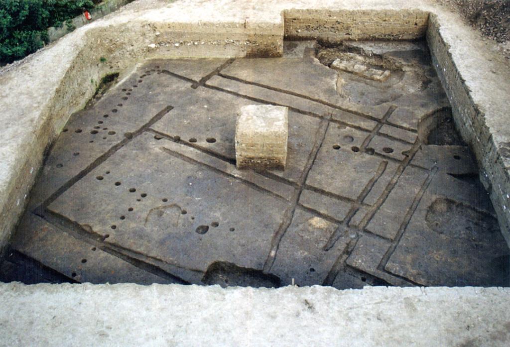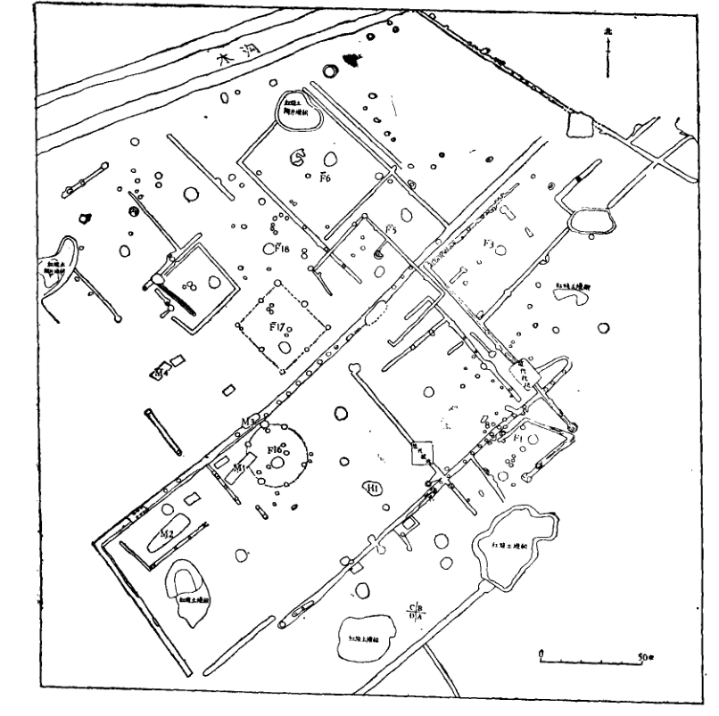 1980年11月,四川省文管會(huì)、四川省博物館與廣漢縣文化館組成聯(lián)合發(fā)掘隊(duì),在三星堆地點(diǎn)東側(cè)進(jìn)行發(fā)掘,發(fā)掘面積1100平方米,于次年5月結(jié)束工作,發(fā)現(xiàn)房址共有18座。這些房址平面形狀有方形、長方形和圓形。通過對(duì)柱洞和溝槽推算,房屋面積一般在10-25平方米之間,多在一側(cè)開門,門的朝向不一,少數(shù)房內(nèi)有隔墻(如F2)。居住面建在生土層上,較堅(jiān)實(shí),可能經(jīng)過踩踏或拍打,少數(shù)居住面上加了一層白膏泥。