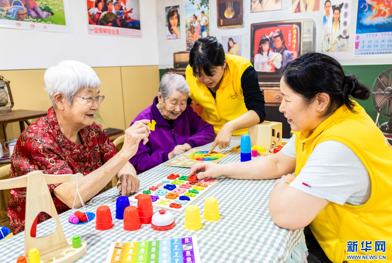 4月8日,工作人員在呼和浩特市玉泉區(qū)居家社區(qū)養(yǎng)老服務(wù)標(biāo)準(zhǔn)化示范中心陪老人玩益智游戲。新華網(wǎng)發(fā)(丁根厚 攝)
