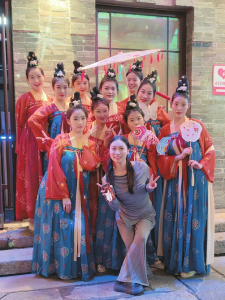 “忻青年”第一個(gè)視頻的標(biāo)題是《跟著我們?cè)诠懦墙值郎响牌饋?lái),民族的才是世界的》。最初的賬號(hào)只是推送藝術(shù)團(tuán)在演出之余的短視頻,用于宣傳沉浸式演出《遇見(jiàn)秀容》。民間舞較大眾化,有熟悉的旋律,廣場(chǎng)舞動(dòng)作簡(jiǎn)單又生活化,容易普及。通過(guò)短視頻讓更多的人了解忻州古城,看見(jiàn)《遇見(jiàn)秀容》團(tuán)隊(duì)演出之余的生活。