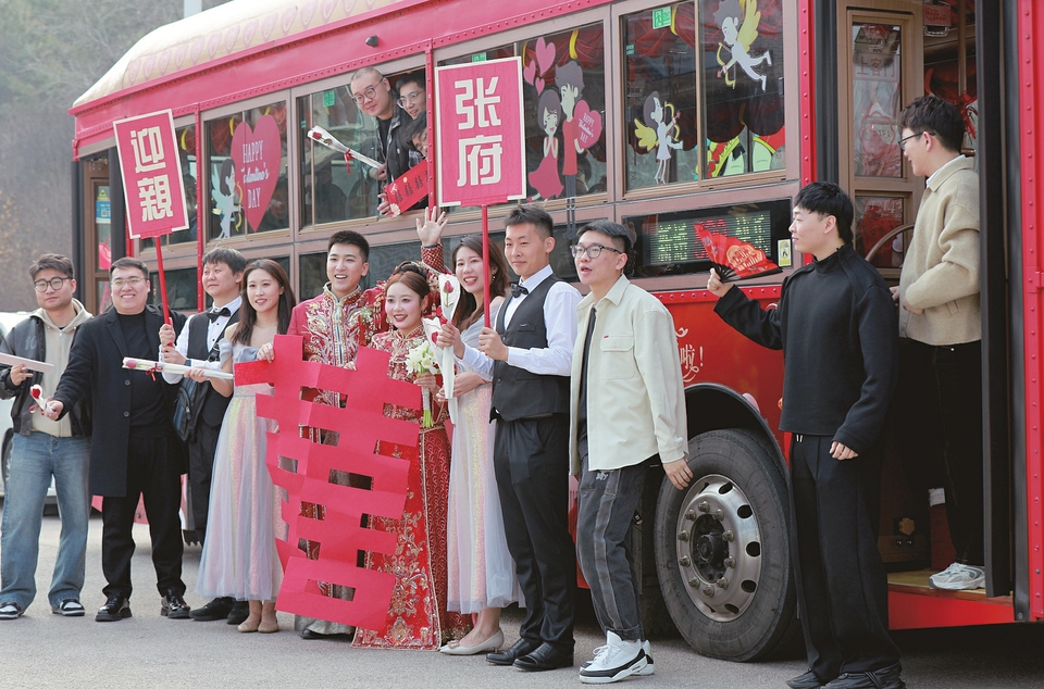 3月10日,在臨汾市區(qū)濱河路,一對新人在23路“1314”幸福主題公交巴士前拍照留念。隨著新時代婚禮習俗觀念的改變,年輕人選擇公交當婚車,成為當下一種時尚創(chuàng)新的婚禮形式。