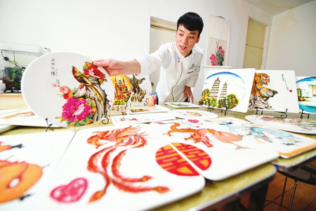 在阿峰工作室內(nèi),擺放著很多這幾年他精心制作的果醬畫作品,在方形和圓形的瓷盤上,有風(fēng)景、動物、建筑……每一幅都栩栩如生,不僅細(xì)膩美觀,還可食用?!捌饺绽?,我除了工作,最喜歡在安靜的時候琢磨,有時為了一個作品要花上五六個小時來創(chuàng)作。果醬畫讓我大開眼界,不僅能畫出流暢的線條,還能畫出五彩斑斕的世界,更讓我找到了人生的目標(biāo)。”阿峰介紹。