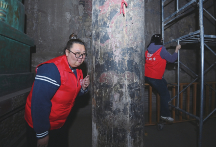 4月10日,張靜通過敲擊聽音來檢測(cè)正殿后檐金柱有無中空現(xiàn)象。