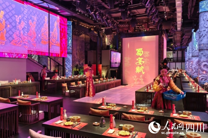 東郊記憶園區(qū)內以蜀地文化為創(chuàng)作背景,溯源中國傳統宴飲儀禮打造的全景沉浸式漢文化主題餐秀——蜀宴賦。人民網 趙祖樂攝