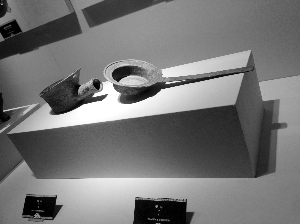 唐朝就已經(jīng)有熨斗了。展廳中,展出了兩把熨斗,一把是唐朝的,一把是清朝的。唐朝的熨斗有一個短短的把手,中間是一個大凹槽。