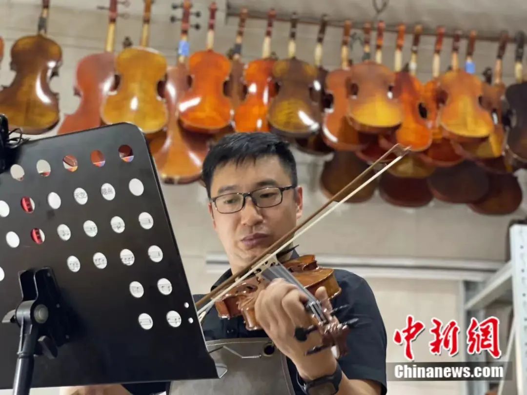 “80后”仇新亮是靚琴坊的創(chuàng)辦人,他的工作室就設(shè)在江蘇鳳靈樂器集團(tuán)的街對(duì)面,房間里掛滿了樂器,從這里每年要售出幾百把提琴。
