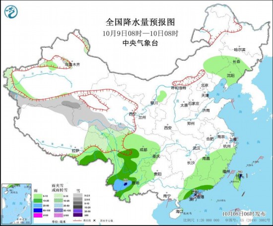圖2 全國(guó)降水量預(yù)報(bào)圖(10月9日08時(shí)-10日08時(shí))