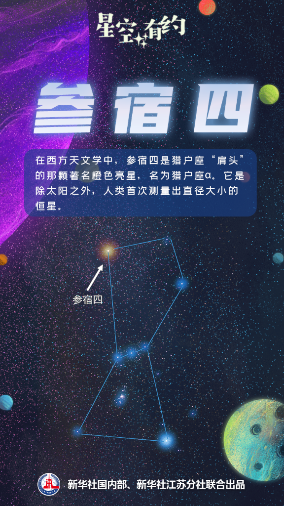 在西方天文學中,參宿四是獵戶座“肩頭”的那顆著名橙色亮星,名為獵戶座α。作為一顆紅超巨星,參宿四的半徑很大,約為太陽半徑的幾百倍。目前它已進入“衰老”階段,是一顆“老年恒星”。它是除太陽之外,人類首次測量出直徑大小的恒星。