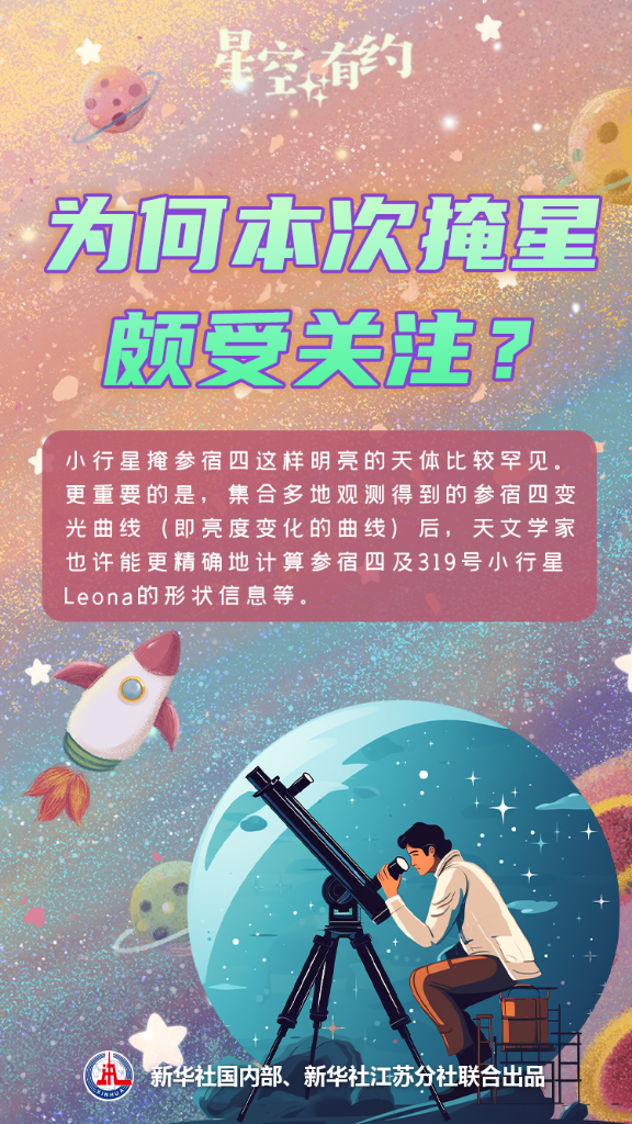 太陽系的行星、小行星等在移動時,時常會掩住遠處的恒星。不過,小行星掩參宿四這樣明亮的天體比較罕見?!皯{肉眼看到參宿四明顯變暗或‘消失’,將會是一次難得的體驗。”王科超介紹說,此次掩星不僅有觀賞性,還具有科學價值。集合多地觀測得到的參宿四變光曲線(即亮度變化的曲線)后,天文學家也許能更精確地計算參宿四及319號小行星Leona的形狀信息等。