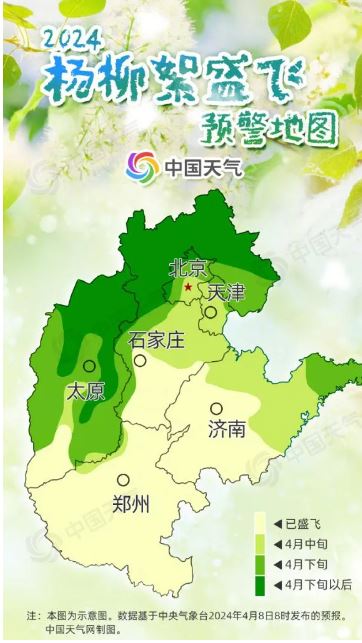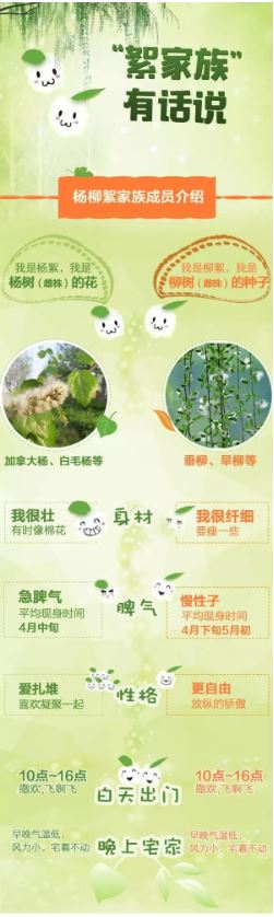 以華北地區(qū)最早開(kāi)始飄絮的白毛楊為例,當(dāng)日平均氣溫大于0℃時(shí),白毛楊才能正常生長(zhǎng)發(fā)育,將這些超過(guò)0℃的數(shù)值累加起來(lái),當(dāng)總和達(dá)到480℃,且日平均氣溫達(dá)到14℃,楊絮就開(kāi)始飄飛。華北一帶,往往4月上旬前后達(dá)到這一標(biāo)準(zhǔn)。楊絮飄飛10余天后,柳絮也會(huì)進(jìn)入飄飛期。