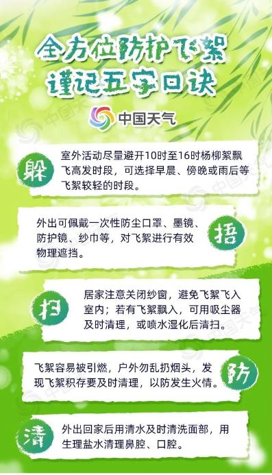 隨風(fēng)飄散的飛絮可能會(huì)攜帶花粉、粉塵等物質(zhì)入侵人體呼吸道,引發(fā)皮膚或呼吸系統(tǒng)的過(guò)敏癥狀,且楊柳絮屬于易燃物,遇到明火會(huì)迅速燃燒蔓延,甚至引燃其他可燃物,釀成火災(zāi)。記住五字口訣,全方位防護(hù)擾人的“四月雪”。