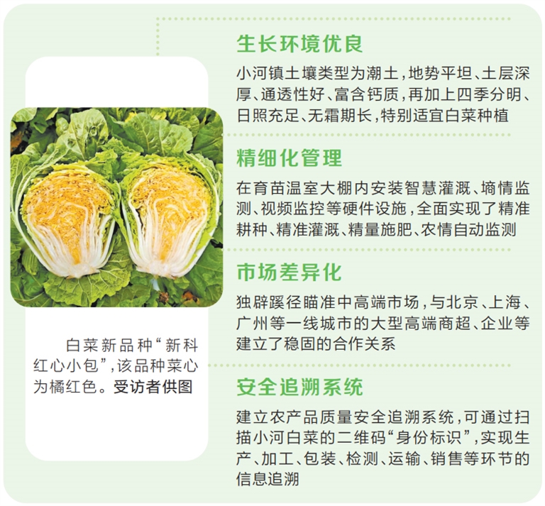 品質(zhì)優(yōu)良的白菜,對生長環(huán)境也十分敏感。小河鎮(zhèn)土壤類型為潮土,地勢平坦、土層深厚、通透性好、富含鈣質(zhì),再加上四季分明、日照充足、無霜期長,特別適宜白菜種植。2018年,農(nóng)業(yè)農(nóng)村部正式批準(zhǔn)對“??h小河白菜”實施農(nóng)產(chǎn)品地理標(biāo)志登記保護,覆蓋小河鎮(zhèn)境內(nèi)崔堡、下灘、張劉莊等47個行政村,并對原產(chǎn)地范圍進行了明確規(guī)定。